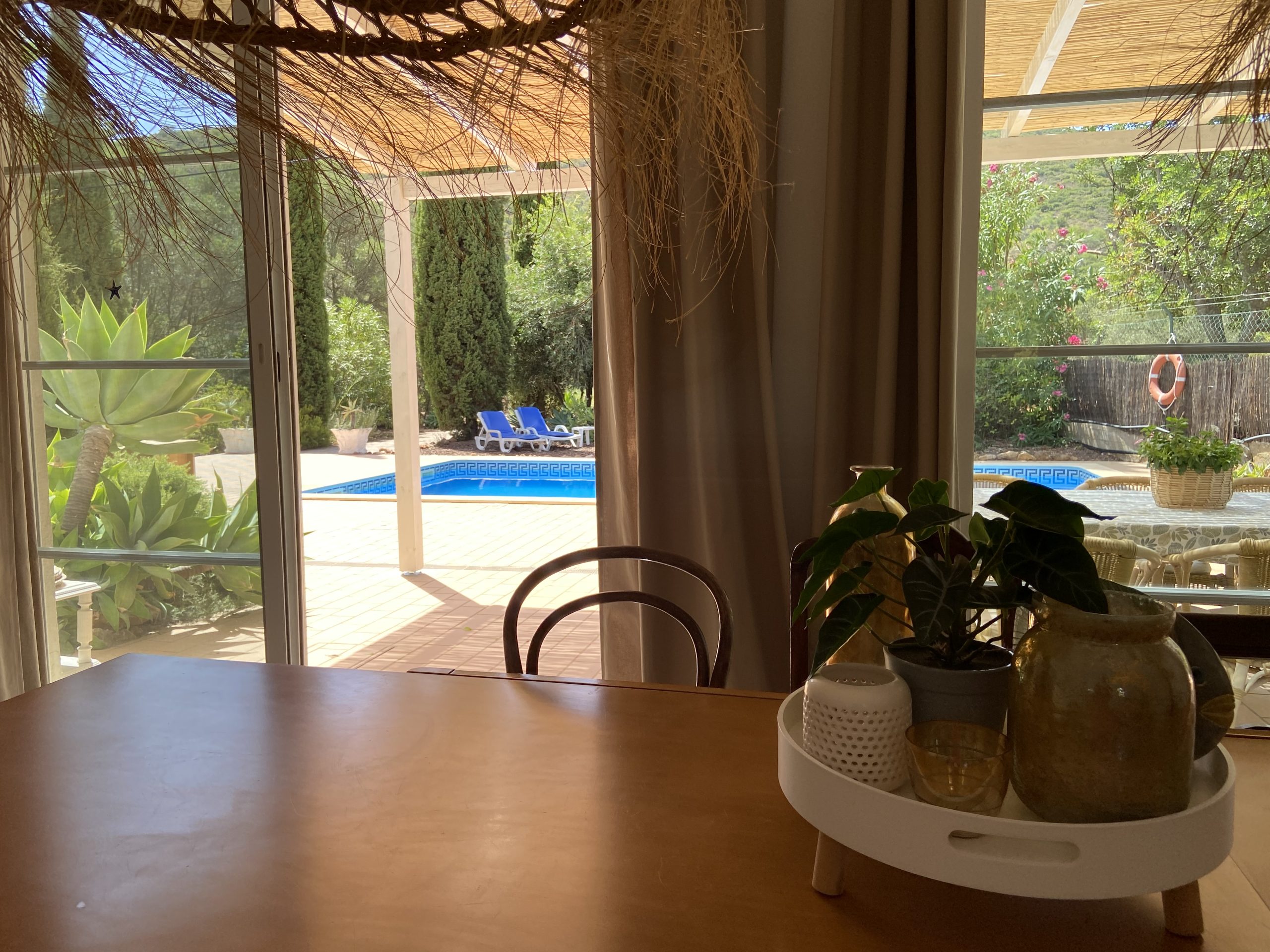 Veel natuurlijk lichtinval in huis, een zeer ruime living, 3 x twee-persoons slaapkamers, 2 badkamers en een nieuwe volledig ingerichte keuken. Buiten een groot terras op het zuiden met een geweldig zwembad (9 x 5 meter) en buitendouche. De villa is omringd door een kleurrijke tuin met prachtige volwassen palmbomen, (fruit-)bomen, (vet-)planten en verschillende schaduwplekken om heerlijk te zitten. Het perceel van 1650 m2 is volledig omheind, heeft een grote (af te sluiten) toegangspoort, een oprit met geweldige cipressen en parkeergelegenheid op eigen terrein. Toegang tot het huis is goed via een rustieke landweg.